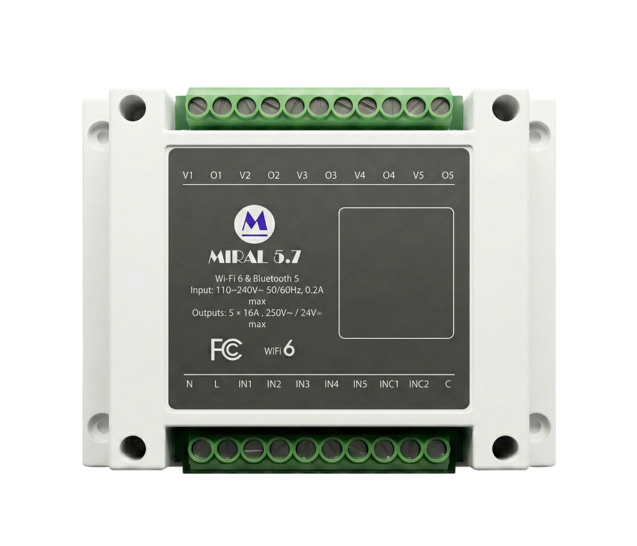 The MIRAL 5.7 is a compact Wi-Fi smart-home controller designed for electrical panels. Offering 5 high-power outputs and 7 versatile inputs. It centralizes the automation of lights, shutters, appliances, sensors, and more all from a single, flexible module.